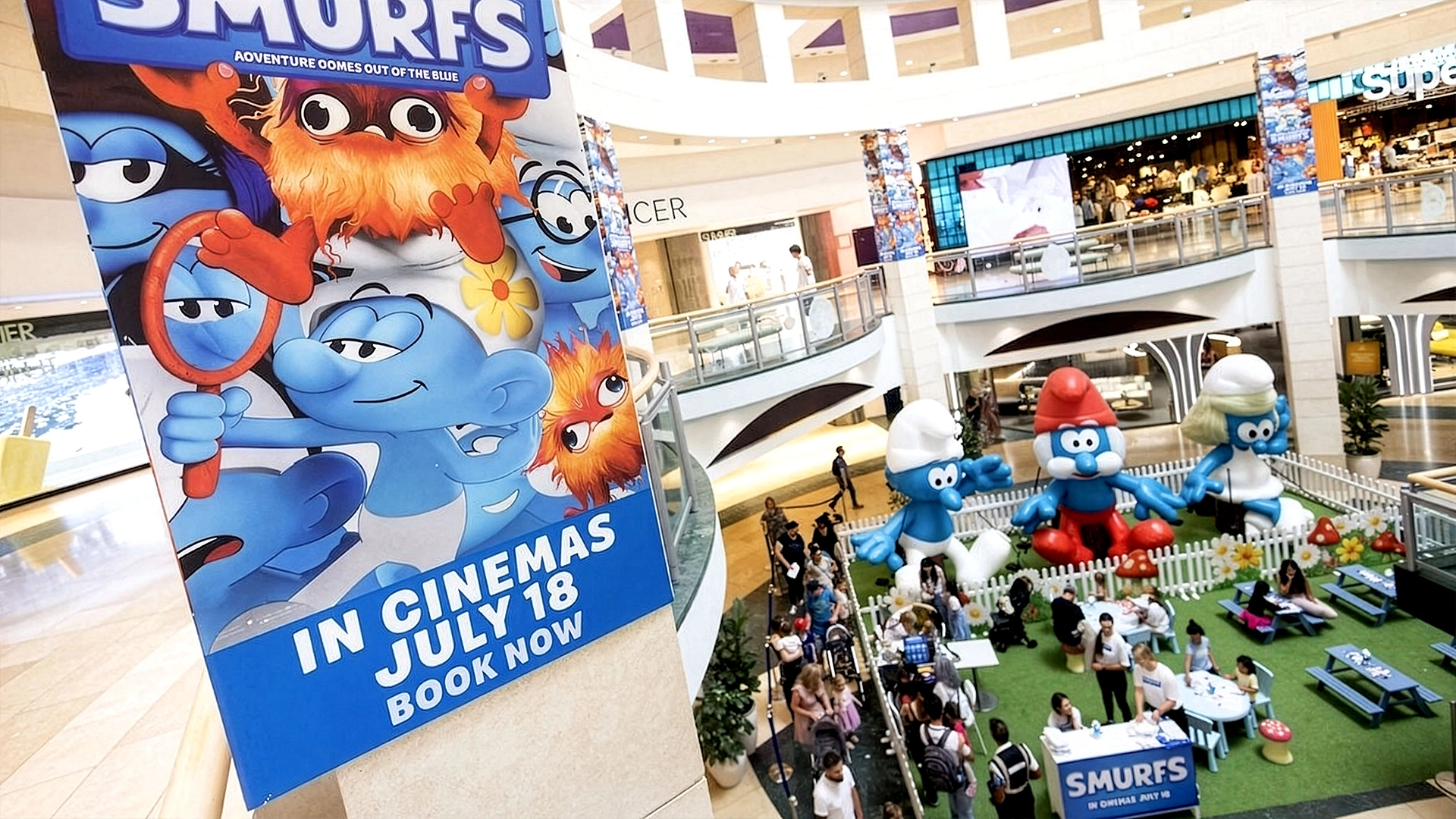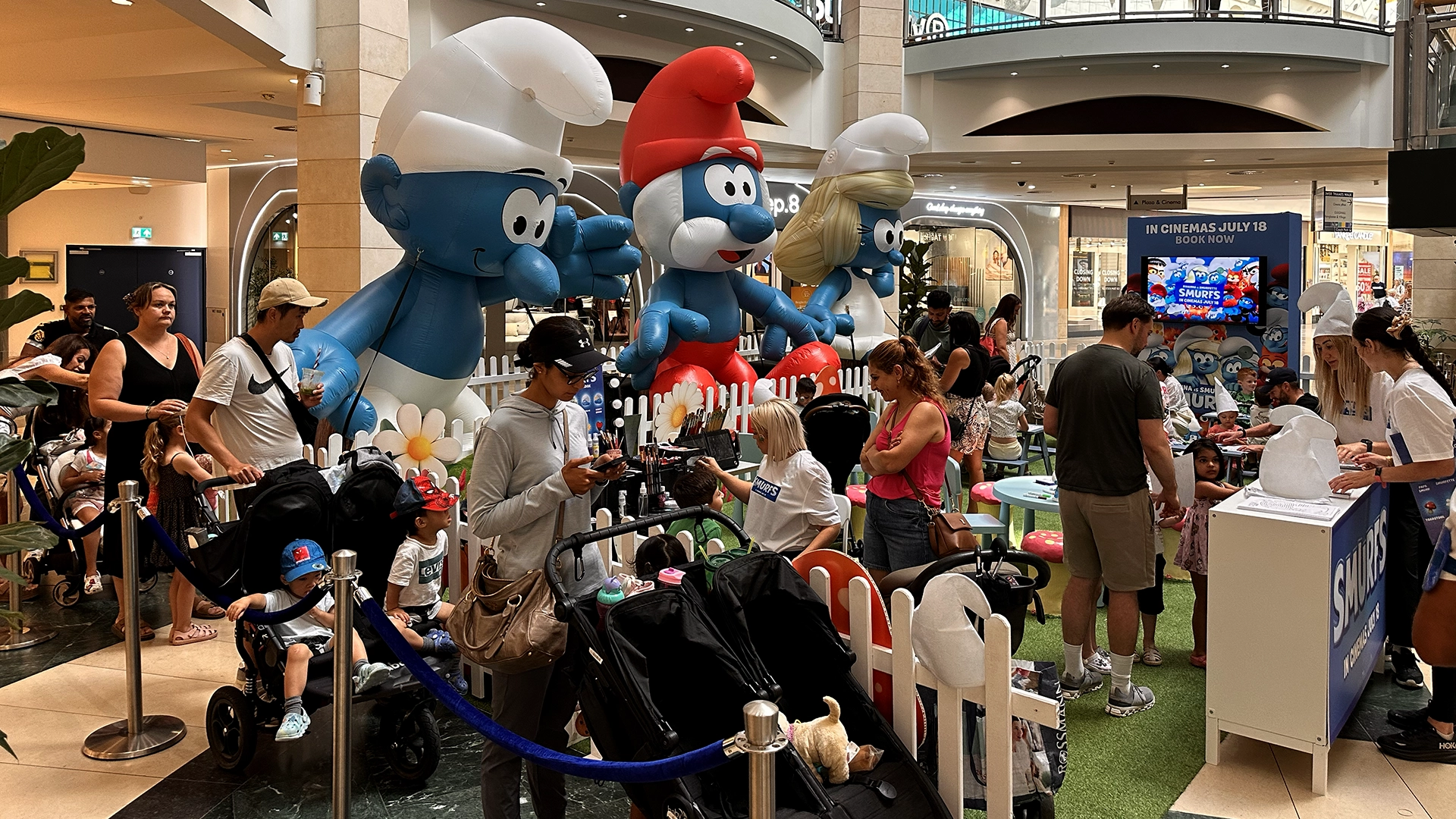 Guests were greeted by three giant inflatable Smurfs, transforming the mall into a magical Smurf village.